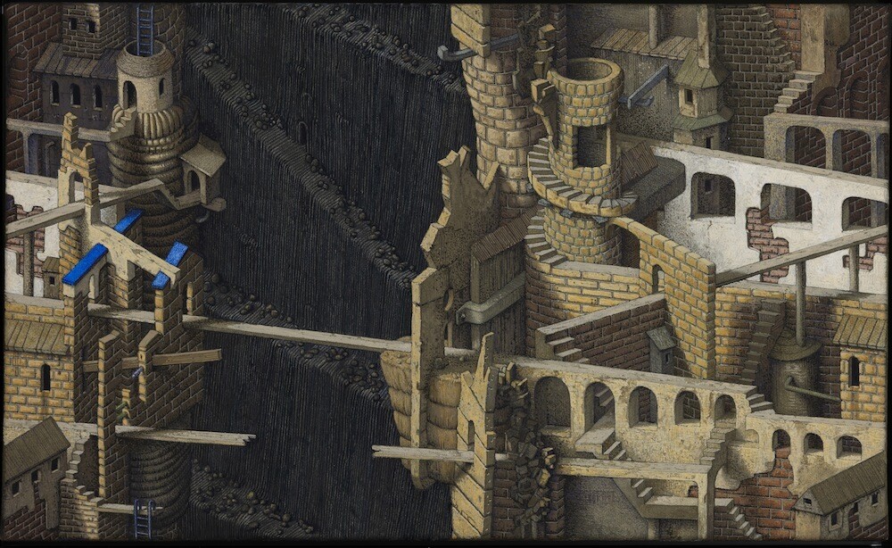 Surreal, märchenhaft, gar chaotisch erscheinen Knut Müllers Landschaften auf den ersten Blick. Folgt man jedoch den schier unendlich verschlungenen Pfaden, erschließen sich alsbald Müllers mathematisch-rhythmische Gestaltungsprinzipien, die im Kosmos des Malers, Musikers und auch Spielentwicklers für innere Ordnung und Geschlossenheit sorgen.