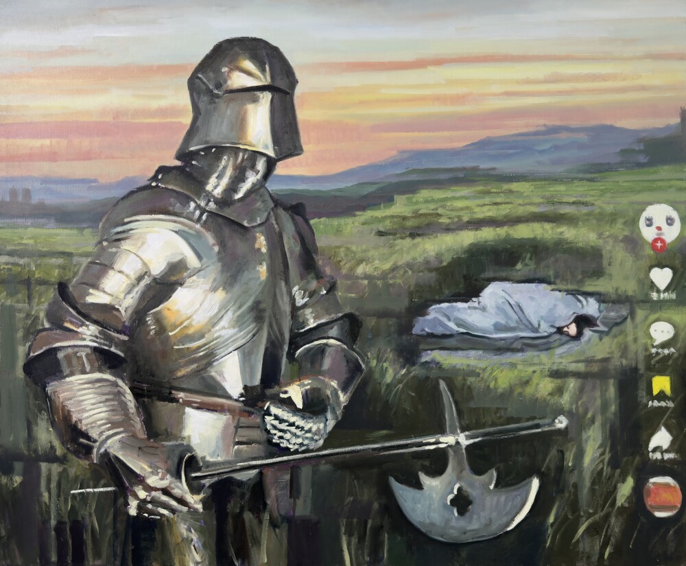 Toni Minge, der an der HGB Leipzig bei Prof. Annette Schröter studierte, konfrontiert mittelalterliche Herrschaftssymbole wie Rüstung und Wappen mit Bildwelten der Gegenwart: Smartphones, App-Logos, Interfaces. Er zeigt, wie Tech-Konzerne zu neuen „Fürsten“ werden – unsichtbar, aber machtvoll. Eine Ausstellung, die mit den Mitteln der Malerei digitale Machtstrukturen sichtbar macht.